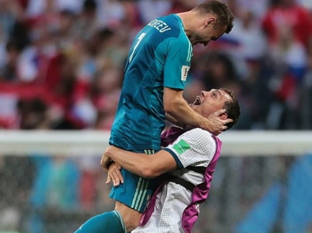 Copa 2018: Espanha e Rússia. Igor Akinfeev, da Rússia, defende penalidade da Espanha.
